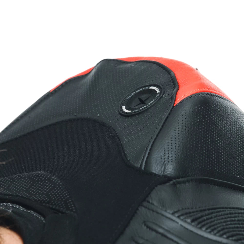 The aluminum plates on the knees, shoulders and elbows – an iconic Dainese feature – are designed to assist the slide in the event of an accident. The Replaceable Slider System (RSS) makes it possible to change the knee slider without changing the position of the base attached to the Velcro on the suit. The sliders at the elbows can easily be adjusted to two pre-defined positions, according to preference and the lean angle reached.